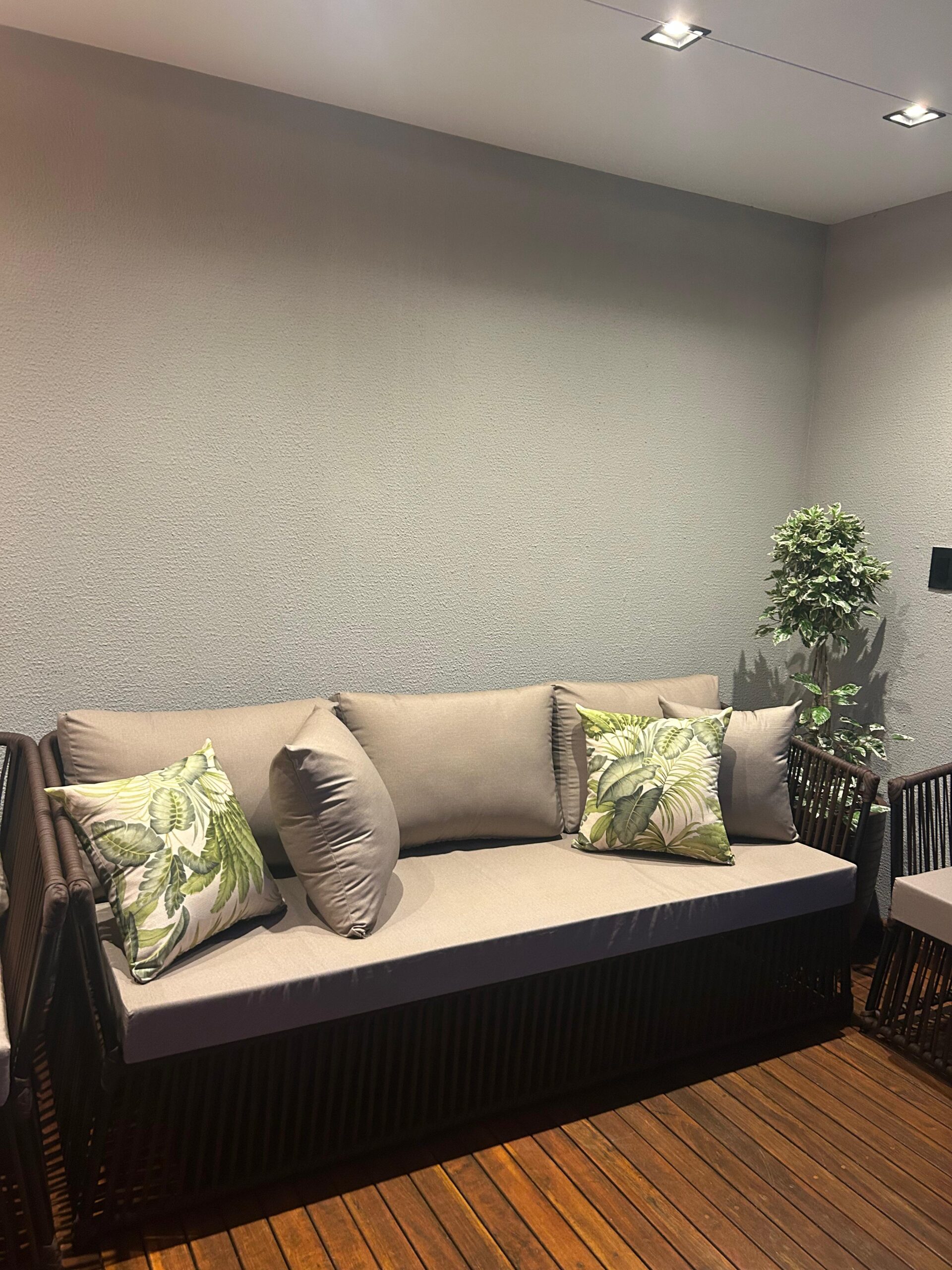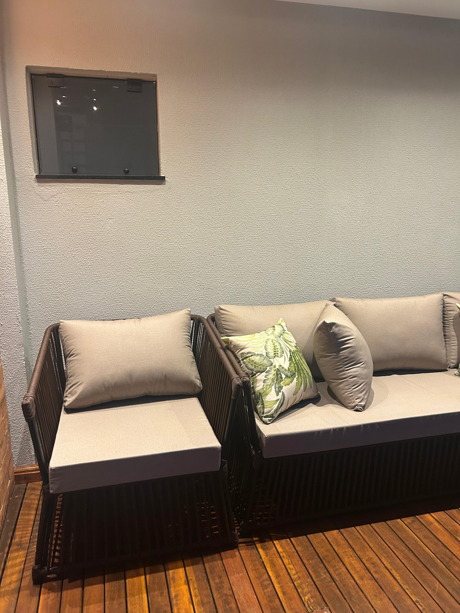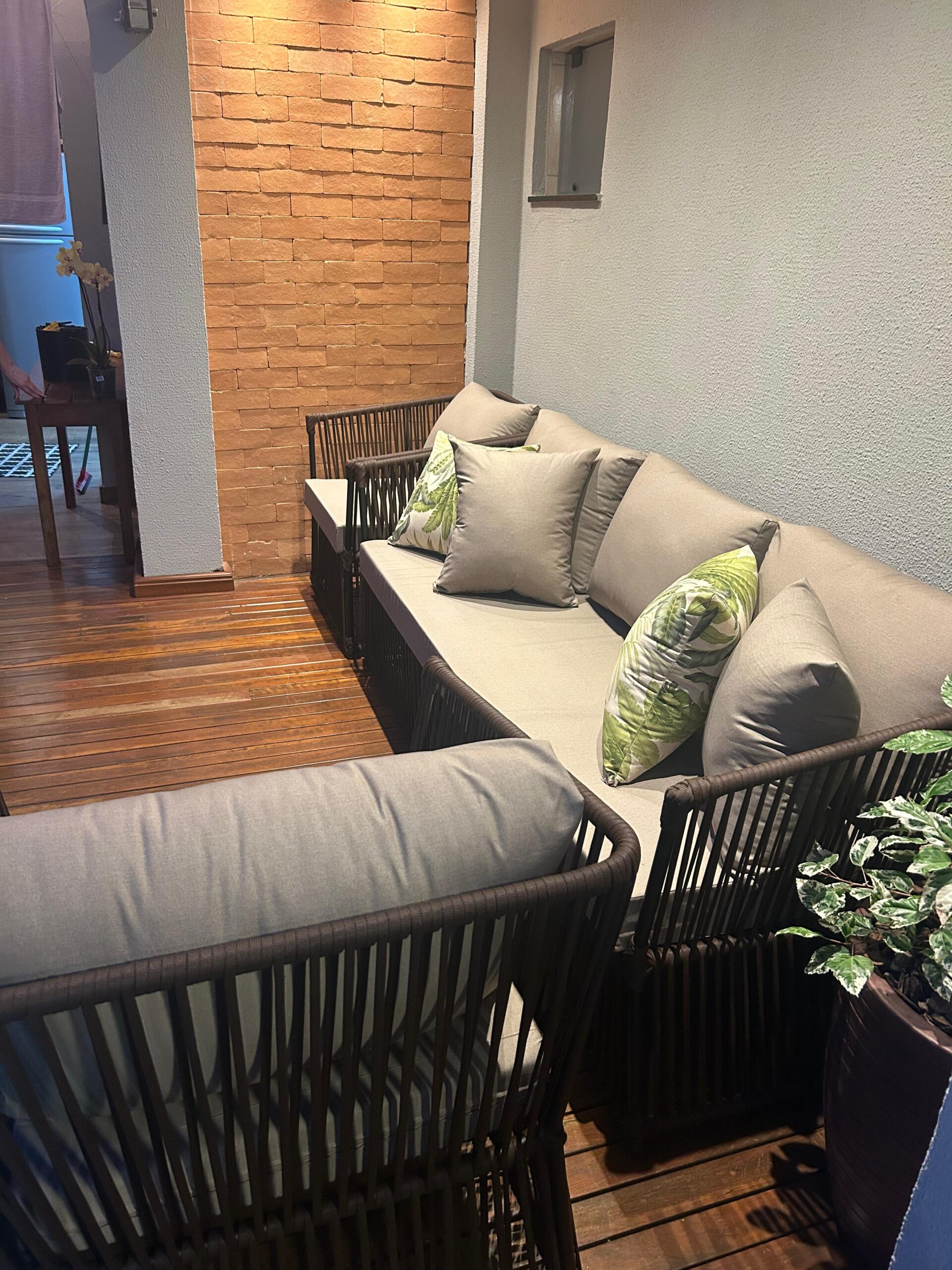 Acompanha almofadas de assento e encosto e 4 almofadas decorativa soltas